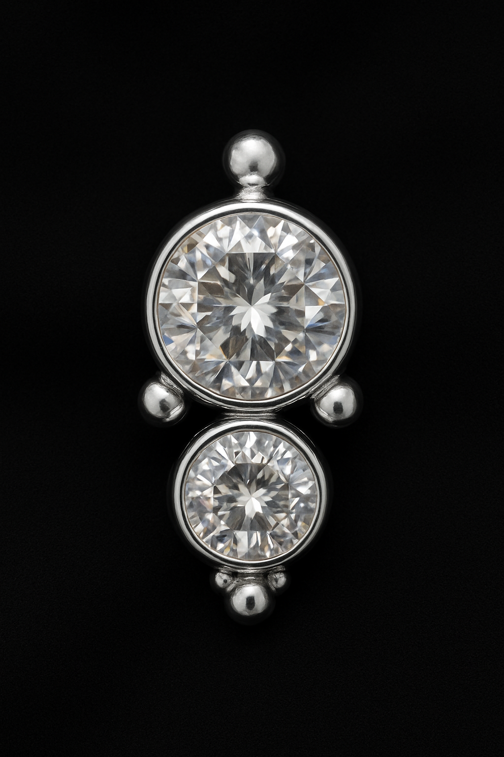 Kolczyk Double Shine to połączenie dwóch osadzonych kryształów w oprawie z certyfikowanego tytanu klasy implantologicznej ASTM F136. Zaprojektowany z myślą o trwałości, bezpieczeństwie i estetyce. Idealny do microdermala — dodaje subtelnej elegancji każdemu stylowi, niezależnie od okazji.