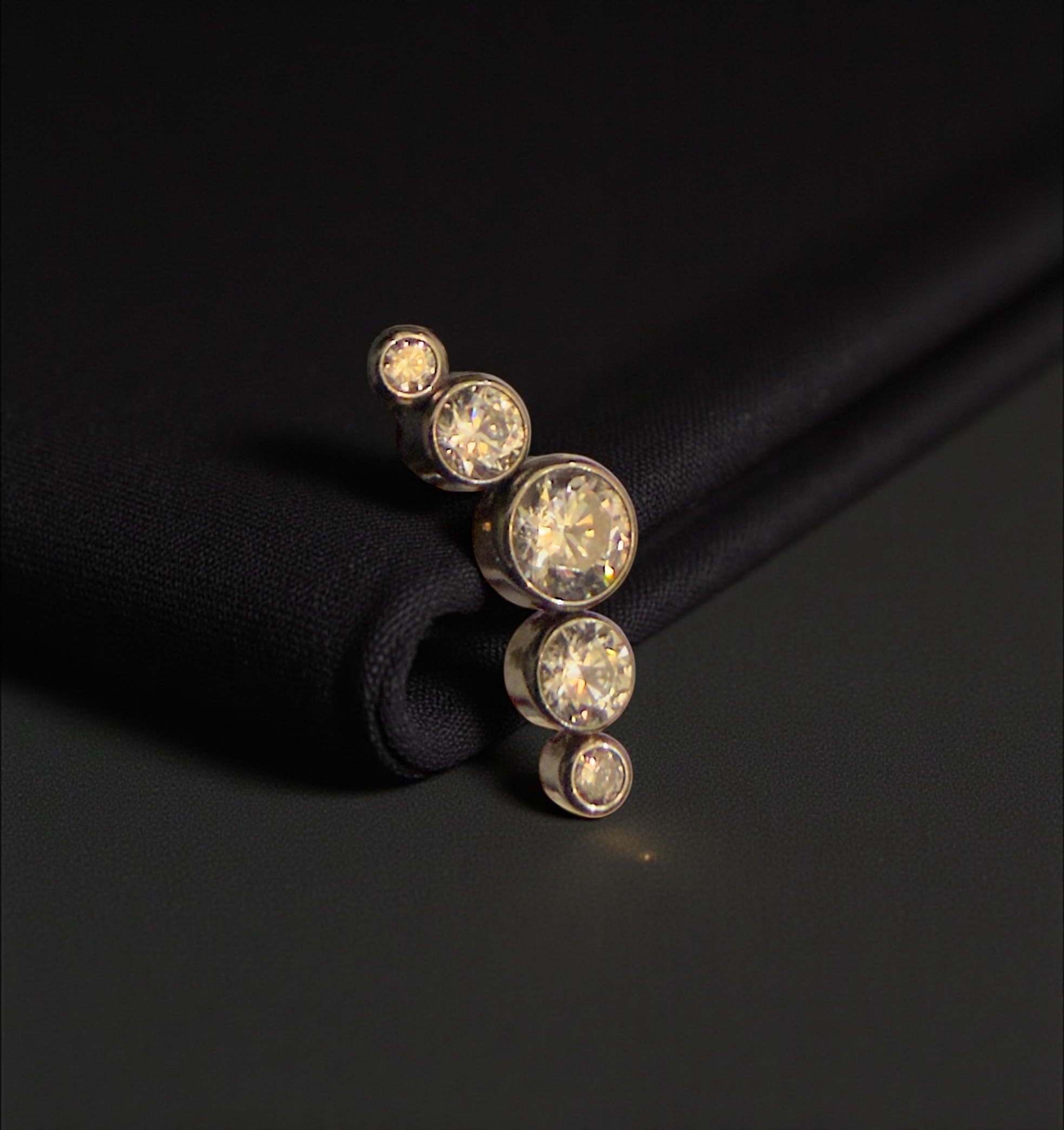 Elegancki łuk wykonany z najwyższej jakości tytanu medycznego. Pięć lśniących kryształów o różnych rozmiarach tworzy efektowną kompozycję, która idealnie dopasowuje się do anatomii ucha.