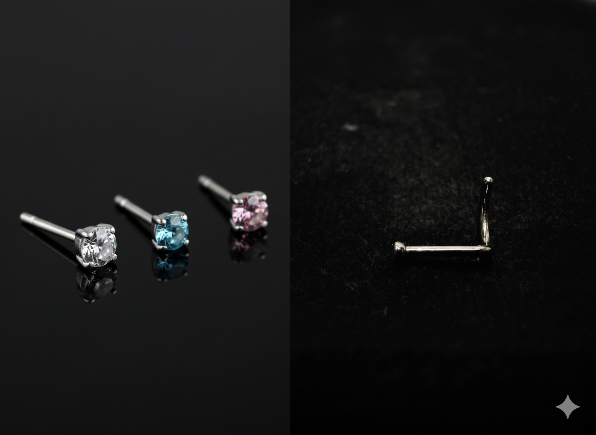 Kolczyk typu pigmej (L-bend) zapewnia wygodne zakładanie i stabilne utrzymanie w przeroście nosa, bez ryzyka wypadania.